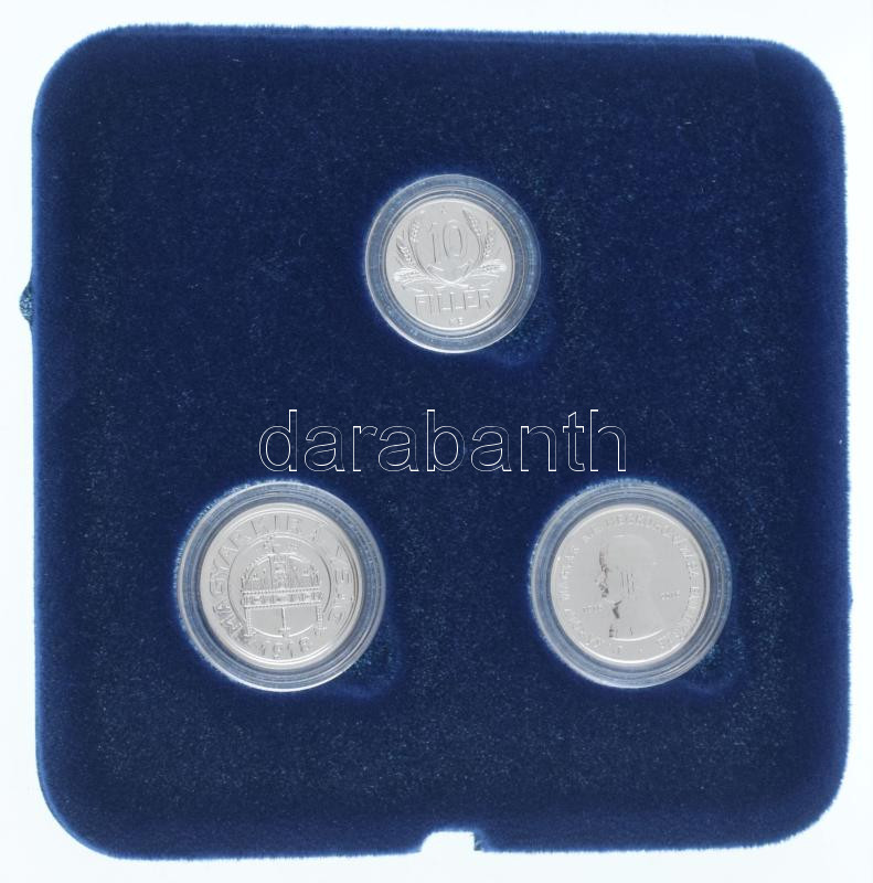 1917. 10f Ag utánveret (2,40g/0.999) + 1918. 50f Ag utánveret (3,45g/0.999) + 1917. 1K Ag utánveret (5,15g/0.999) 2016-ban kiadott utánveret-sor IV. Károly koronázásának 100. évfordulójára, eredeti dísztokban, tanúsítvánnyal T:BU karc
