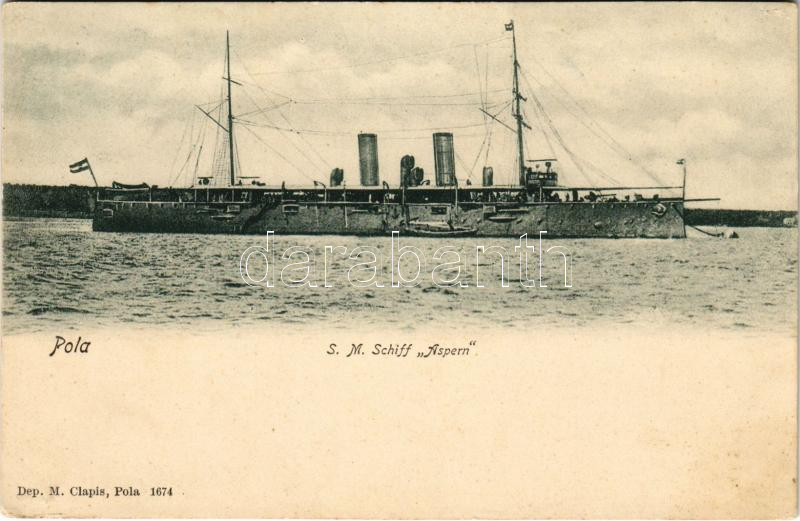 SMS Aspern az Osztrák-Magyar Haditengerészet Zenta-osztályú védett cirkálója / K.u.K. Kriegsmarine / Austro-Hungarian Navy Zenta-class protected cruiser. Dep. M. Clapis Pola 1674. (fl)