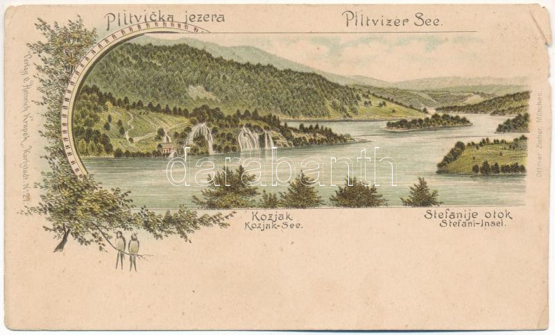 Beschreibung: Plitvicka Jezera, Kozjak, Stefanije otok / Plitvitzer-Seen, Kozjak-See, Stefani-Insel / Plitvicei-tavak / Plitvice Lakes. Verlag v. Heinrich Krapek No. 27. Ottmar Zieher Art Nouveau, floral, litho (b)