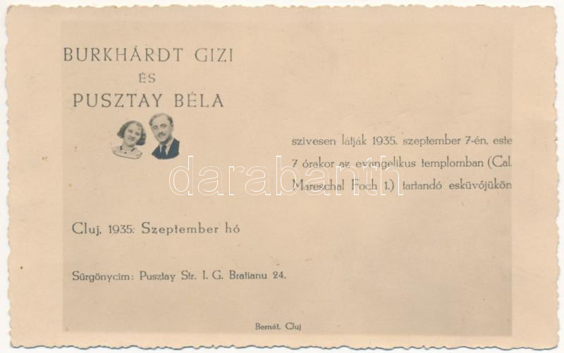1935 Kolozsvár, Cluj; Burkhárdt Gizi és Pusztay Béla esküvői meghívója... https://www.darabanth.com/de/463-Fernauktion/463.0/Ansichtskarten/Siebenburgen~1500007/1935-Kolozsvar-Cluj-Burkhardt-Gizi-es-Pusztay-Bela-eskuvoi-meghivoja-wedding-invitation~II3116805