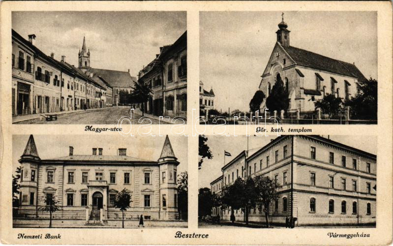 Beszterce, Bistritz, Bistrita; Nemzeti bank, vármegyeház, Magyar utca, üzletek, görög katolikus templom / bank, country hall, street, church (fl)