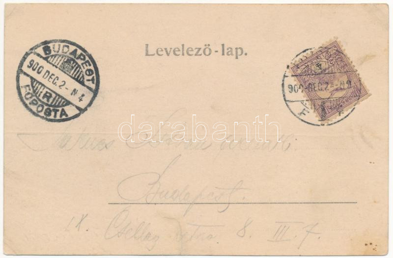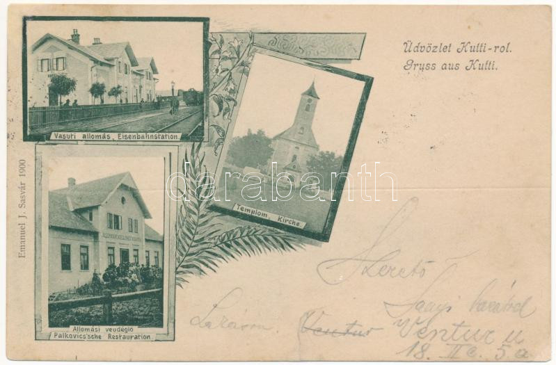 1900 Jókút, Kutti, Kúty; vasútállomás, templom, Palkovics vasúti állomási vendéglője, étterem. Emanuel J. kiadása / railway station and restaurant, church. Art Nouveau, floral (r)