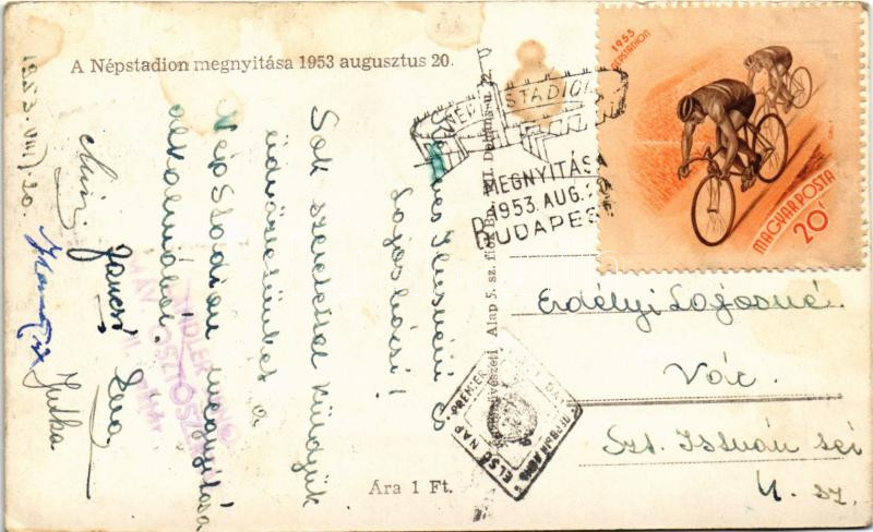 1953 augusztus 20. A budapesti Népstadion megnyitása, birkózás. Képzőművészeti Alap Kiadóvállalat / Opening of the People's Stadium, wrestling, wrestlers s: Gáll. F. (fl)