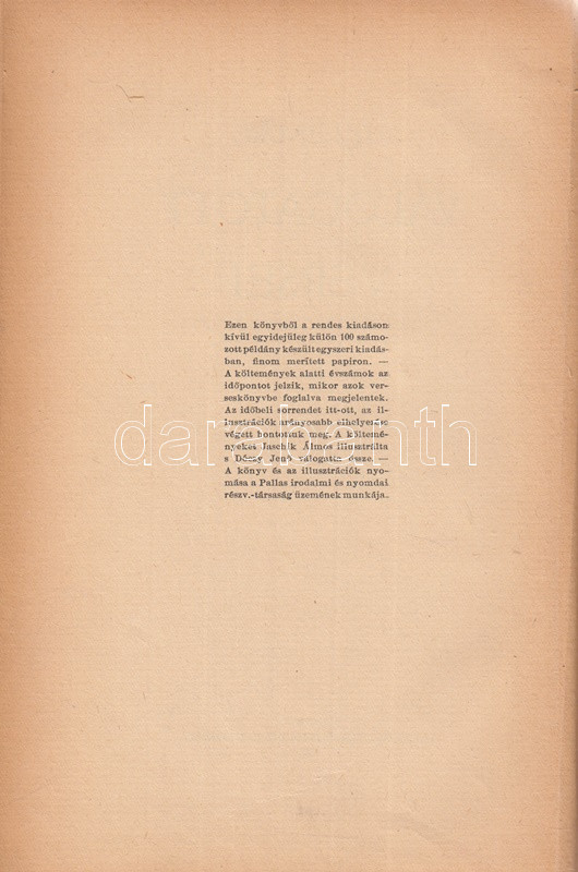 Jaschik Álmos rajzával illusztrált, enyhén sérült gerincű kiadói egészvászon kötésben. Jó példány.