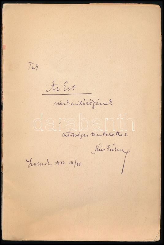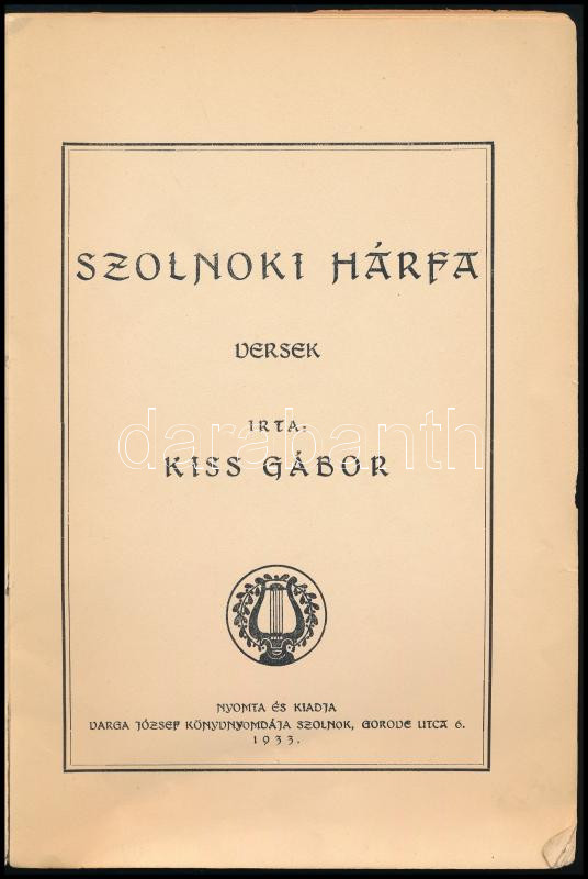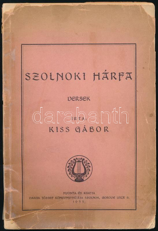 Kiss Gábor: Szolnoki hárfa. Versek. (DEDIKÁLT). Szolnok, 1933, Varga József-ny., 59+(5) p. Első kiadás. Kiadói papírkötés, sérült borítóval, belül nagyrészt jó állapotban. A szerző által DEDIKÁLT példány: ,,Az Est szerkesztőségének készséges tisztelettel Kiss Gábor, Szolnok, 1933.VII/11."