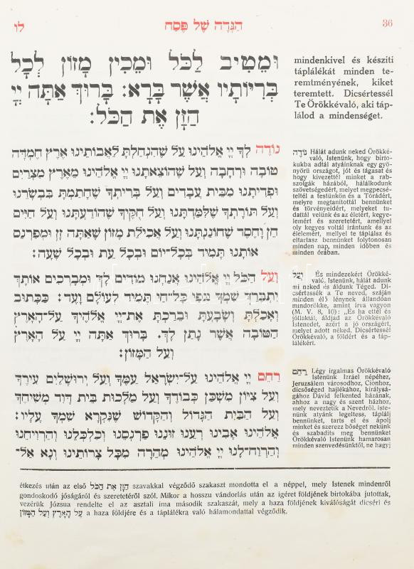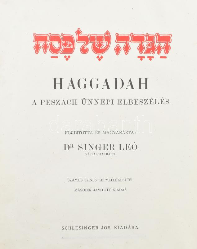 Haggadah. A peszách ünnepi elbeszélés. Ford. és magyarázta: Dr. Singer Leó. Bp., é.n. (cca 1920), Schlesinger Jos. (Neuwald Illés-ny.). Második javított kiadás Egészoldalas és duplaoldalas színes illusztrációkkal. Magyar és héber nyelven. Kiadói félvászon-kötés, kopott borítóval, egyik lap alsó sarkában szöveget nem érintő sérüléssel, helyenként foltos lapokkal.