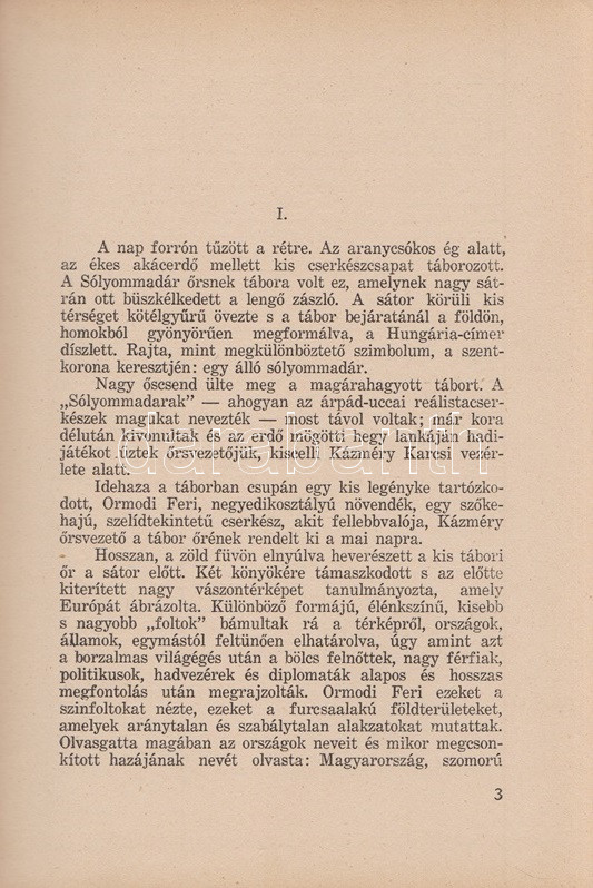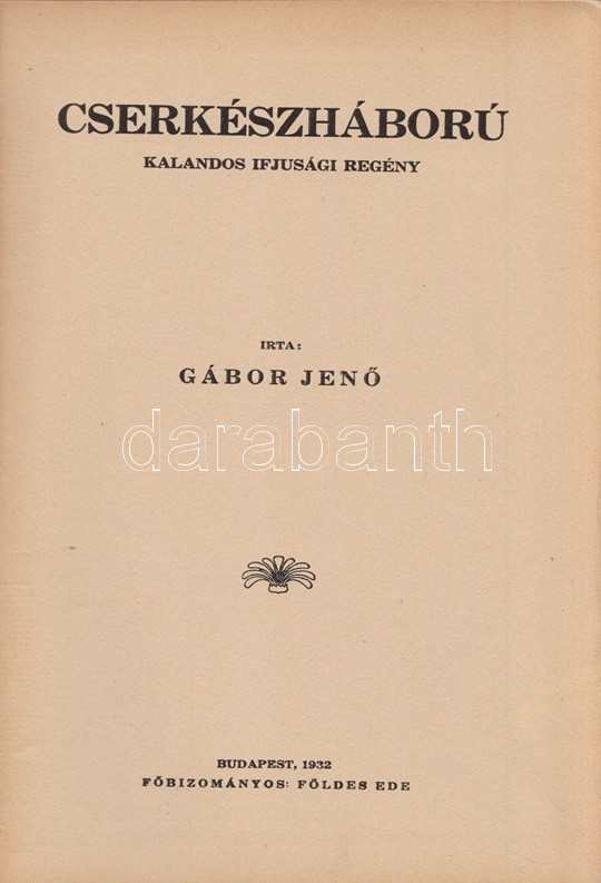 Gábor Jenő cserkészeti témájú ifjúsági regénye két kiadásváltozatban készült, példányunk a ritkább, illusztrálatlan változatból való. Az 1933-ban Gödöllő városában megrendezett nemzetközi cserkész találkozó alkalmából tervbe vették az ifjúsági regény megfilmesítését (Függetlenség, 1933. április 28.). Az első előzéken régi tulajdonosi könyvjegy.