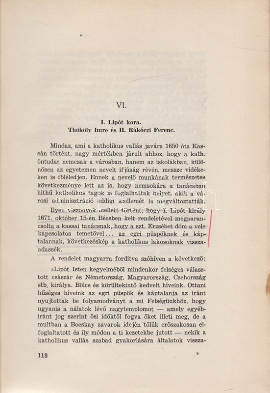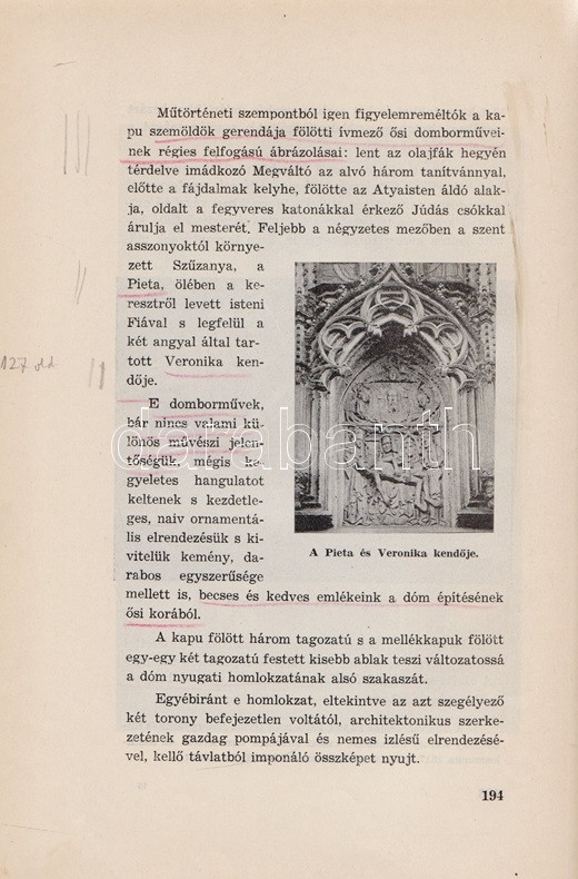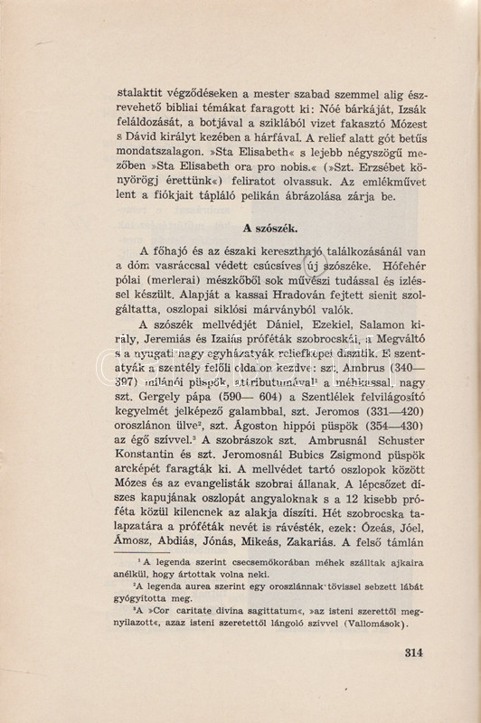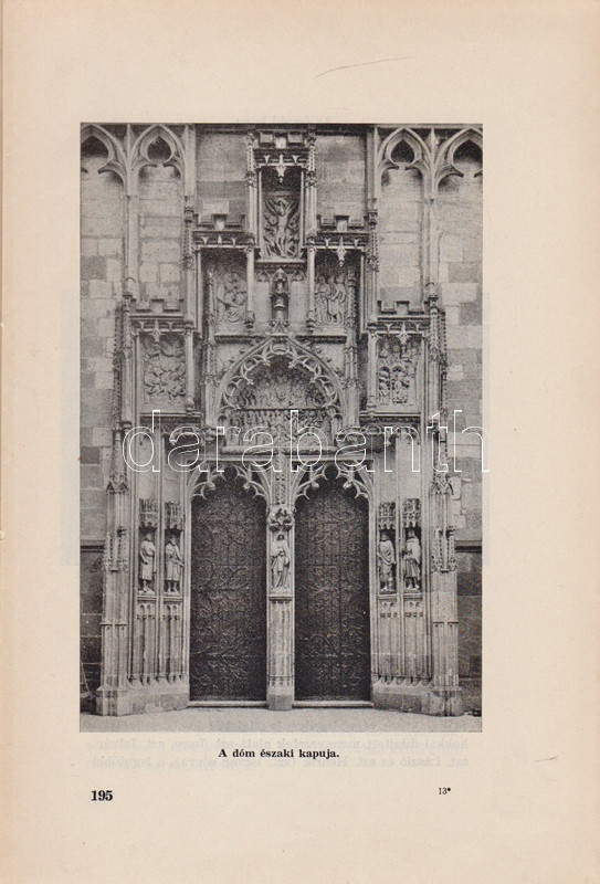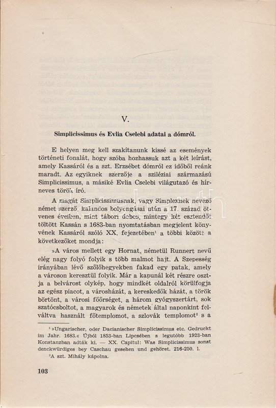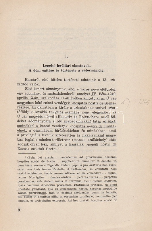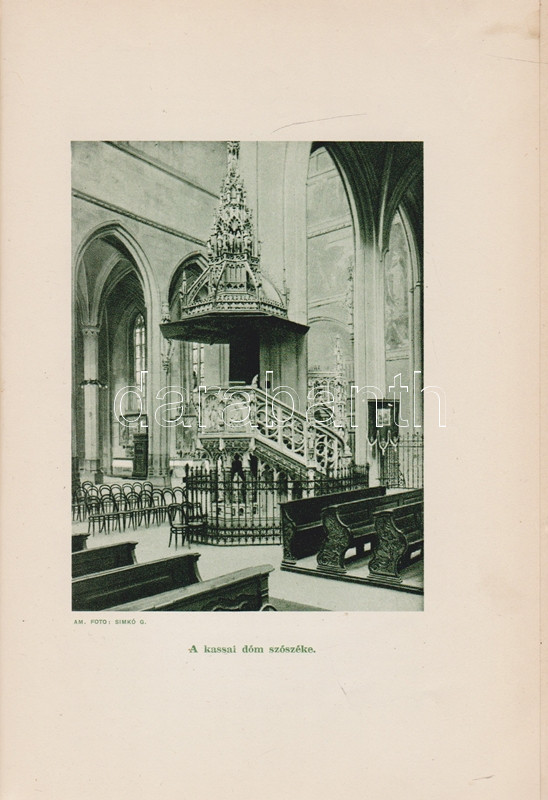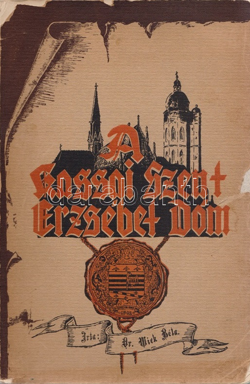 Wick Béla: A kassai Szent Erzsébet dóm. [Kassa] Košice, 1936. ,,Szent Erzsébet"-nyomda Rt. 1 t. (hártyapapírral védett címkép) + 438 + [2] p. + 9 t. (hártyapapírral védett). Egyetlen kiadás. A közép-európai egyházi építészet és képzőművészet kiemelkedő jelentőségű együttesének, a kassai dómnak első monográfiaigényű feldolgozása, oldalszámozáson belül gazdag egész oldalas és szövegközti illusztrációs anyaggal, a művészettörténeti rész előtt a téma társadalomtörténeti feldolgozásával. Az első nyomtatott levélen apró pótlás, a könyvtest a 16. ív előtt kettévált, kötetünk fűzése meglazult. Fűzve, színes, illusztrált, hiányos gerincű kiadói borítóban, az első borítón apró pótlás.