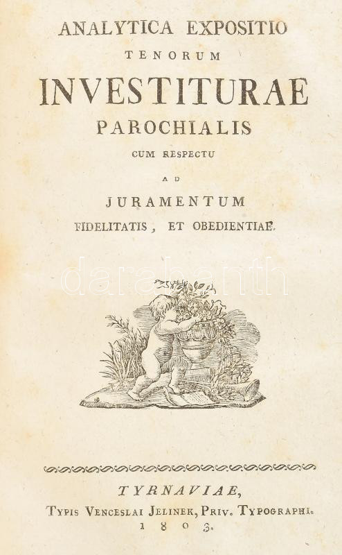 (Bärenkopf, Ignác): Methodus recte gubernandi parochiam... I-II. kötet. Methodus recte gubernandi parochiam... II. kötet. (Nagyszombat) Tyrnaviae, 1803. Jelinek. 1 t. (címképmetszet), 2 lev. 384 l. 3 lev. Hozzákötve: (Fuchs, Xaver Ferenc): Moralis philosophiae christianae de virtutibus, et vitiis tractatus pro omnibus... Posonii, 1805. Landerer. VIII, 208 l. 1 lev. Baerenkopf Ignác (1741-1809) katolikus püspök, jezsuita szerzetes. A jezsuita rend feloszlatása után pozsonyi kanonok, majd a rizanói püspöki címet nyerte el. 1805-ben papnevelő intézet első rektora, majd a pesti egyetemen a teológiai kar igazgatója. Korabeli aranyozott gerincű egészbőr-kötésben, eredeti gerinc-címkével, festett lapszélekkel, sérült gerinccel