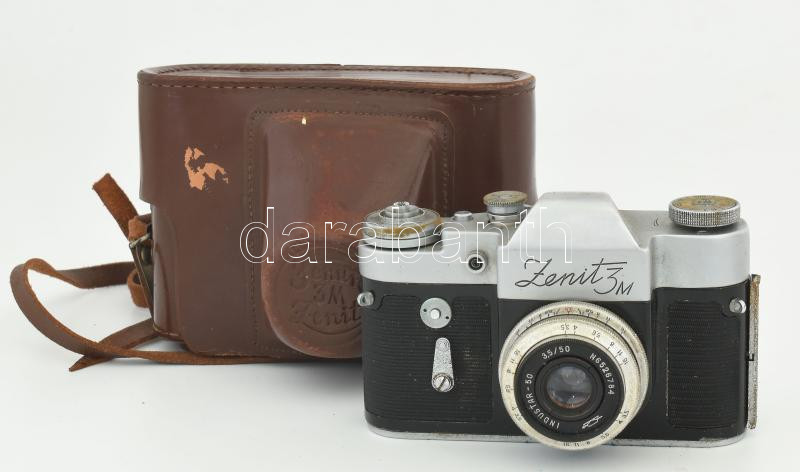 cca 1960-1970 Zenit 3M szovjet fényképezőgép, 35mm filmformátum, Industar-50 50mm f/3.5 objektívvel, eredeti bőr tokjában, némi kopottsággal / Vintage USSR camera, in original leather case, with slight wear