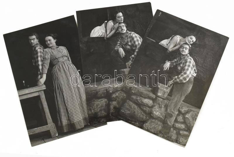 Gábor Miklós és Sulyok Mária: 3 darabos fotósorozat, Várkonyi hidegpecséttel, vintage színházi jelenetfotók a Vágy a szilfák alatt. cé- darab 1946-os Nemzeti Színházbeli előadásáról. 9x14 cm