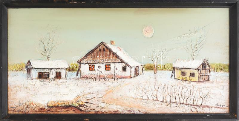 Beschreibung: Póka György (1944-): Tanya. Vegyes technika, farost, jelzett, fakeretben. 27×56 cm