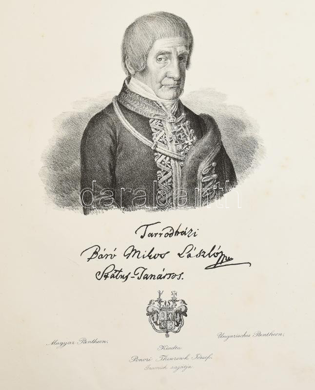 Magyar Pantheon az 1825-1827. Pozsonyban tartott országgyűlések emlékezetére. Alapította 's kiadta Ponori Thewrewk József. Az ismeretlen teljes sorozatból 15 db rézmetszetű portré, egyházi és világi főemberek portréja az ábrázolt személy kézjegye és titulusa, alatta címere. 23x32 cm Korabeli sérült gerincű félvászon kötésben, egy-két lapon foltok. + sorozat 2. és 3. füzetének jó állapotú borítói, rajtuk a képek jegyzékével., Maguk a borítók nagyon ritkák.