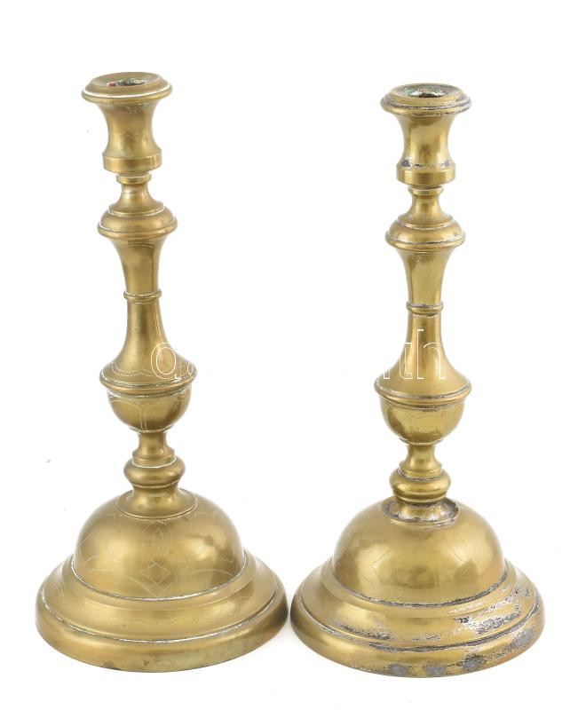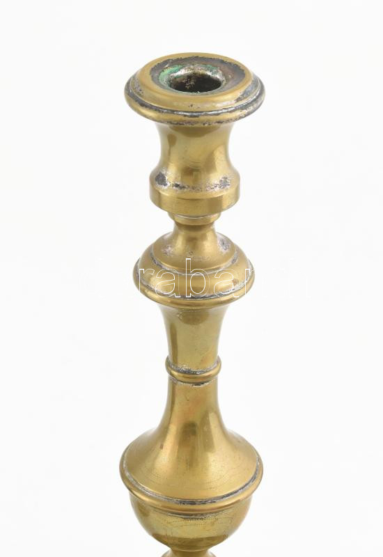 Beschreibung: Antik ezüstözött gyertyatartó pár. Egyiken jelzett: sérült címkén "...ász Nándor ékszerész" felirat. Lekopott ezüstözéssel, réz vagy alpakka lemez, m: 36 cm