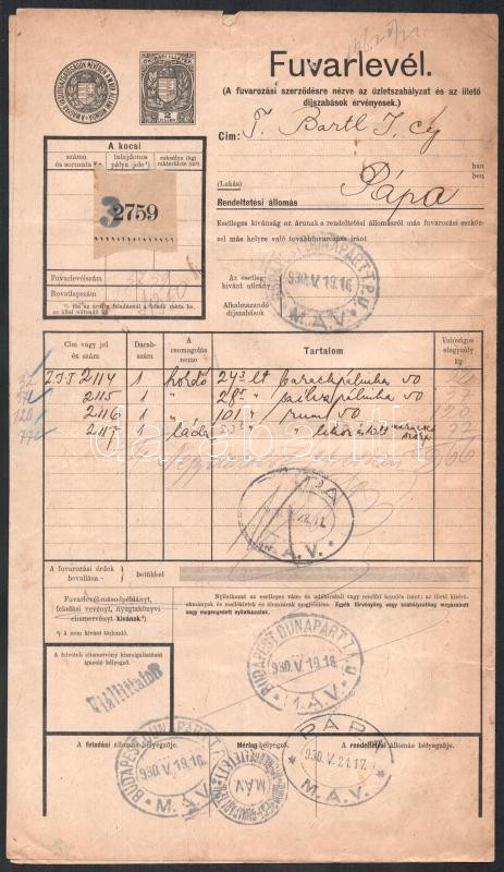1930 Zwack J. és Társai Vasúti Fuvarlevél 1 hordó barackpálinka / szilvapálinka / rum 50% valamint 1 láda likőr és 10 l narancs szörp tárgyában, Pápára küldve, apró szakadásokkal, kissé foltos