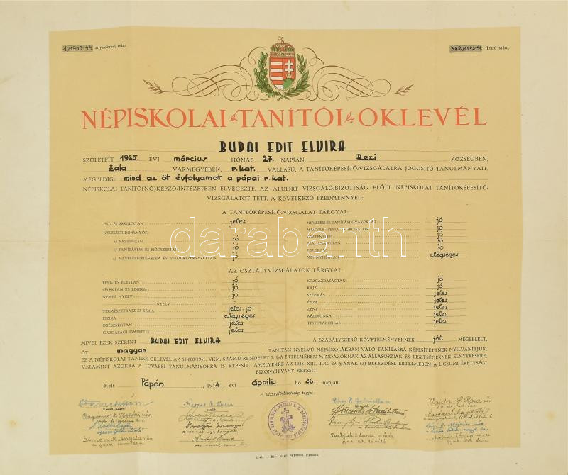 1944 Pápa, népiskolai tanítói oklevél, hajtva, 49,5x41,5 cm https://www.darabanth.com/de/463-Fernauktion/463.0/Kunst-Dokumente-andere-Sammelgebiete/Dokument~1000023/1944-Papa-nepiskolai-tanitoi-oklevel-hajtva-49-5x41-5-cm~II3113866
