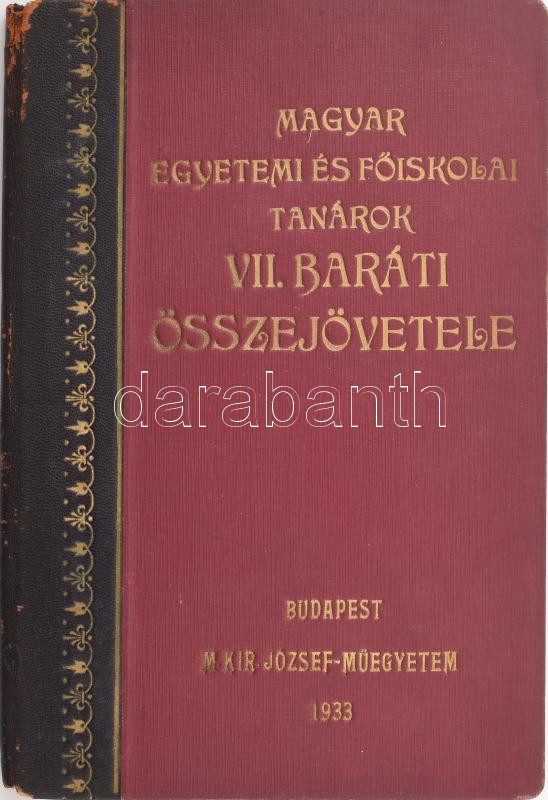 1933 A Felső Oktatási Egyesület közleményei. A VII. baráti összejövetel Dr. Tauffer Vilmos közreműködésével szerkeszti Dr. Misángyi Vilmos. Bp., 1933, Felső Oktatási Egyesület. Korabeli aranyozott félbőr-kötésben, sérült gerinccel, volt könyvtári példány.