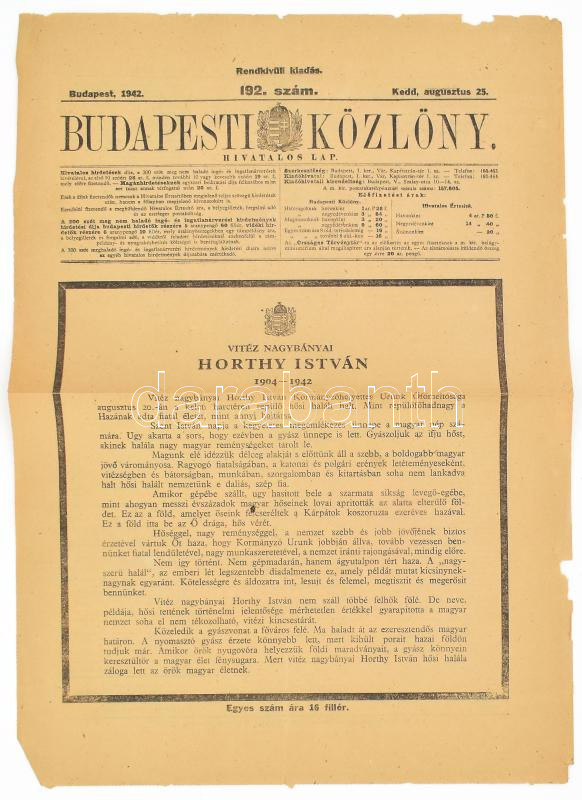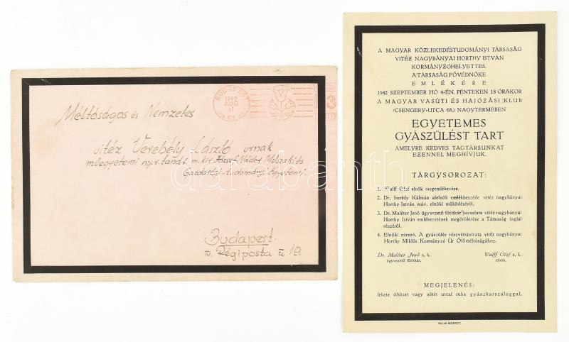 1941 Horthy István kormányzóhelyettes haláláról tudósító Budapesti Közlöny különszám, hozzá a Magyar Közlekedéstudományi Társaság emlékülésének meghívója Horthy István emlékére