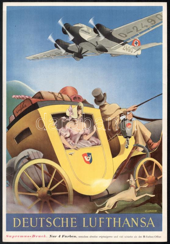 Beschreibung: cca 1936-1945 Deutsche Lufthansa poszter (horogkeresztes, náci felségjelzéssel). Ofszet, papír, szign.: Ullmann, 30,5x21 cm