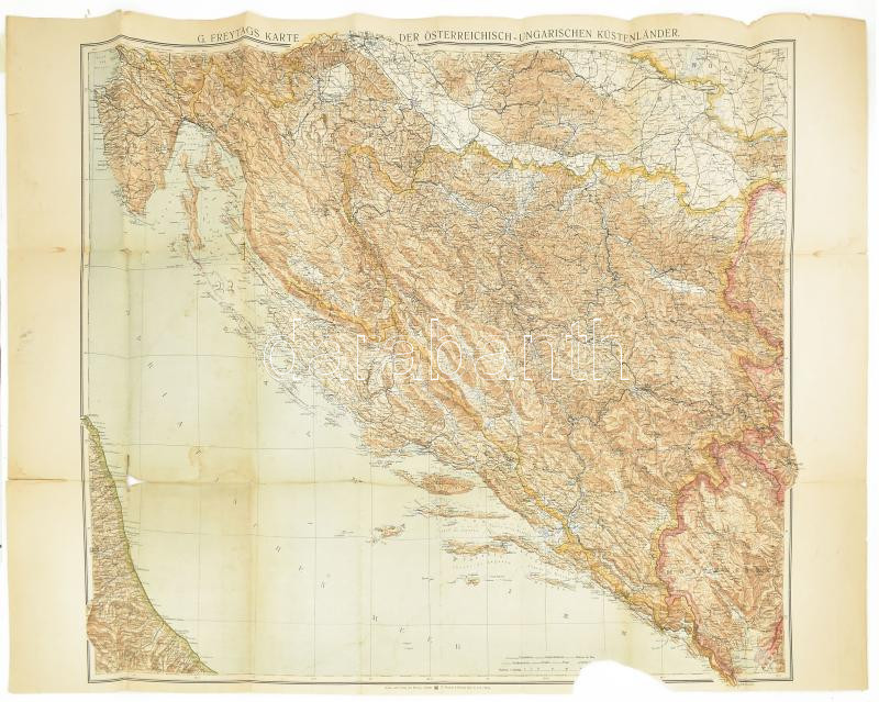 cca 1910 G. Freytags Karte der österreichisch-ungarischen Küstenländer / Az Osztrák-Magyar Monarchia tengerparti részének térképe, 1 : 600.000, Wien, Kartogr. Anstalt G. Freytag & Berndt, sérült, kisebb lapszéli hiánnyal, szakadásokkal, 99x70 cm