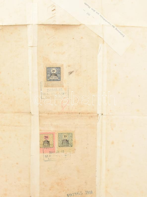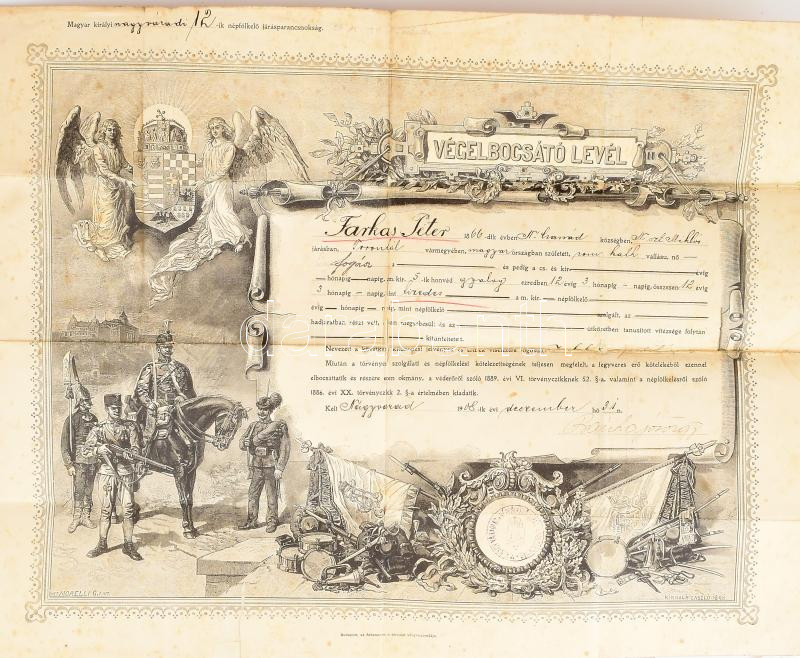 1908 Nagyvárad, végelbocsátó levél nagycsanádi szül. Farkas Péter, a m. kir. 5. honvéd gyalogezred tizedes részére, hátoldalán okmánybélyegekkel, kissé sérült és kissé foltos, részben javított