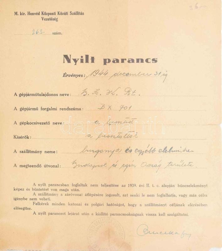 Beschreibung: 1944 Nyílt parancs, burgonya szállításra, hungarista pecséttel