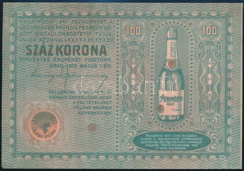 1913. 100 Koronás bankjegy mintájára készült jegyzéklap, Andrényi Kálm... https://www.darabanth.com/de/463-Fernauktion/463.0/Kunst-Dokumente-andere-Sammelgebiete/Werbungen~2000003/1913-100-Koronas-bankjegy-mintajara-keszult-jegyzeklap-Andrenyi-Kalman-utodai-Arad-szecesszios~II3113305