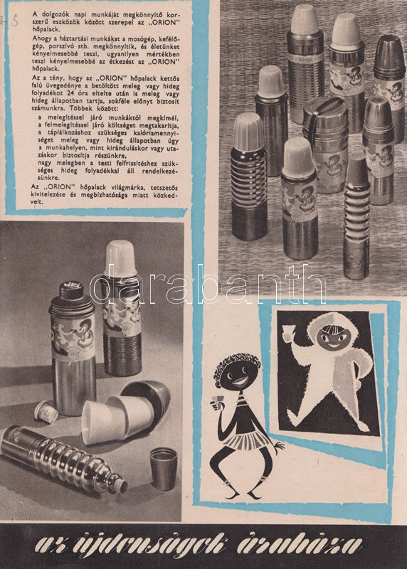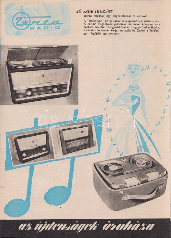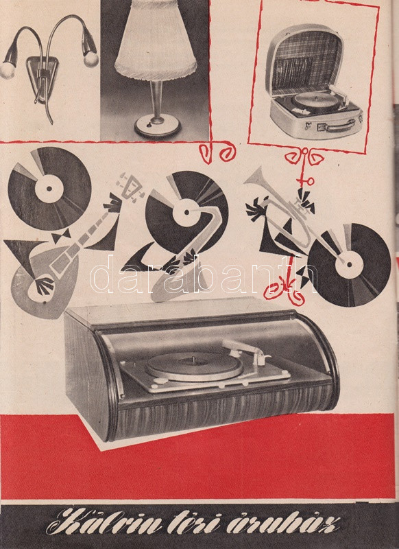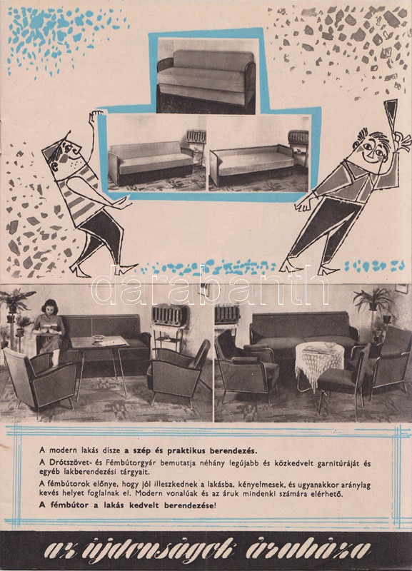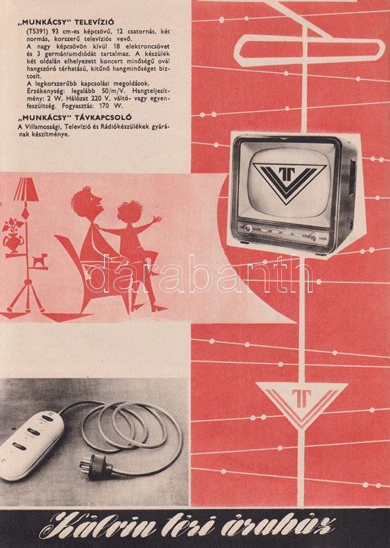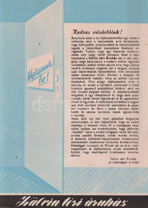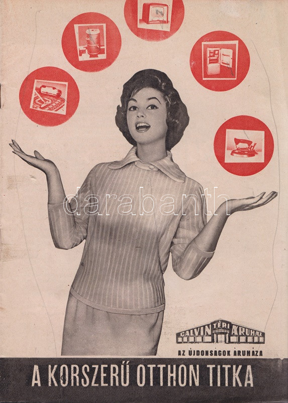 A korszerű otthon titka. A Calvin téri Áruház képes lakberendezési katalógusa (1960 körül) (Budapest), [1960?]. Egyetemi Nyomda. [32] p. A Belváros kapujában, Belső-Ferencváros északi határán, a Kiskörút és a Lónyay utca sarkán 1922-től működött az üzletház, mely Fenyves Dezső alapító után a Fenyves Áruház nevet viselte, és a legkülönbözőbb árucikkeket kínálta, ruházati termékektől lakberendezési cikkekig és iskolaszerekig. A saroképületben működő üzletházat 1949-ben államosították, az 1950-es években Szabadság Állami Áruház, majd Calvin téri Állami Áruház néven üzemelt, később, kisebb átszervezés után, 1960-tól Calvin téri Áruház néven működött - az állami jelző tehát eltűnt -, és elsősorban a lakberendezés és a műszaki cikkek újdonságait volt hivatva bemutatni, de az intézmény ruházati és kozmetikai jelentőségét jól mutatja, hogy a 60-as évek népszerű komikusainak fellépésével egybekötött divatbemutatókat is tartottak itt; mindent összevéve tehát a budapesti kereskedelem markáns helyszínéről van szó. Az 1970-es évektől az áruház a Centrum áruházak hálózatába tartozott, onnantól kezdve az olcsó áruk áruháza jelzőjét kapta, majd a rendszerváltás után a Városkapu üzletház nevét viseli az építmény, és számos más kereskedelmi egységhez hasonlóan az egykori egységes intézmény számos független részre hasadozott. ? Kétszínnyomású, szövegközti karikatúrákkal és felvételekkel gazdagon illusztrált katalógusunk a korai 60-as évek tárgyi kultúráját körvonalazza. Szerepel katalógusunkban az 1959-es Budapesti Ipari Vásáron bemutatkozott fémvázas bútor, a modernségében is szikárnak ható Tihany fotelágy, magyar gyártású televíziókészülékek egész sora: a Videoton által gyártott Munkácsy és Orion tévék több modellje, a hozzá tartozó, az elektromos hálózatba csatlakoztatandó Munkácsy távirányítóval együtt (1960); Csobánc, Badacsony, Kis Szimfónia, Szimfónia, Tihany és Velence márkanevet kapott rádiókészülékek (1959-1960), a Telefongyár Terta orsós magnói, az űrkorszakra való tekintettel a 6 lángú Rakéta csillár. A katalógus egyfajta életmódváltást is sejtet, a modern technika mosógépei és centrifugái, porszívói és hűtőszekrényei, kuktái, kávéfőzői egészen sok időt spórolnak a háziasszonynak. Dokumentumunk emlékezetes vonása, hogy úgyszólván minden termék magyar gyártású és magyar nevet is visel, a bemutatott enteriőrök pedig különös élénkséggel idézik meg a korai 60-as évek tárgyi kultúráját. Bár kiadványunk évszámjelzést nem tartalmaz, számos jel utal a kiadási évre: mindenekelőtt a híradástechnikai eszközök bemutatkozási éve (valamennyi az 1959-1960-as időszakból való), valamint a lakossági pénzintézet logója a belív utolsó oldalán, melyet a pénzintézet az 1954-1959 között használt (az új logó elterjedése ebben az időben jó néhány évet is igénybe vett). Néhány oldalon kézi számítások, gyermekrajzok. Fűzve, színes, illusztrált kiadói borítóban, a hátsó borítón apró sérüléssel.