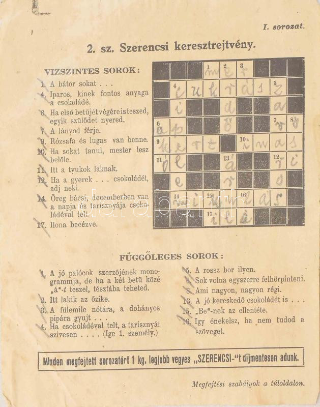 cca 1930 Szerencsi keresztrejtvény I. sorozat/2.sz., megfejtési szabályok a hátoldalon, "Gyártmányainkhoz 1-5 sorszámmal ellátott 5 különféle keresztrejtvényt mellékelünk..." ; hajtott, m: 12x15cm 1 db