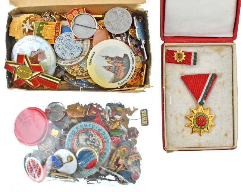 Beschreibung: Kis doboznyi, nagyrészt szocialista jelvény, és kitüntetés tétel, közte 1970. "Felszabadulási Jubileumi Emlékérem" aranyozott, zománcozott bronz kitüntetés mellszalagon, miniatűrrel, tokban T:vegyes
