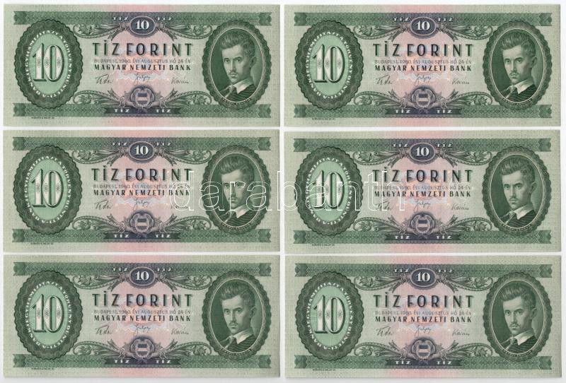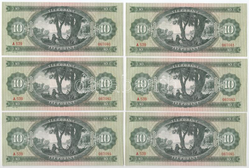1960. 10Ft (6x) sorszámkövetők "A 539 067040 - A 539 067045" T:UNC,AU ... https://www.darabanth.com/de/463-Fernauktion/463.0/Numismatik/Ungarische-Banknoten~500007/1960-10Ft-6x-sorszamkovetok-A-539-067040-A-539-067045-T-UNC-AU-Adamo-F5~II3114650