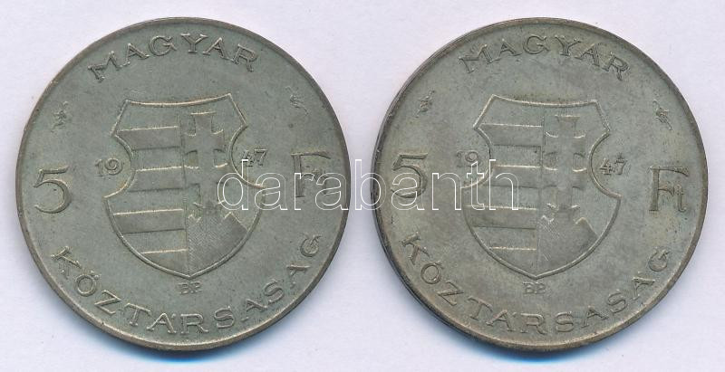 1947. 5Ft Ag "Kossuth" (2x) T:VF patina Adamo F8.1.1 https://www.darabanth.com/de/463-Fernauktion/463.0/Numismatik/Ungarische-Munzen-und-Munzen-mit-ungarischem-Munzzeichen~500008/1947-5Ft-Ag-Kossuth-2x-TVF-patina-Adamo-F811~II3118739