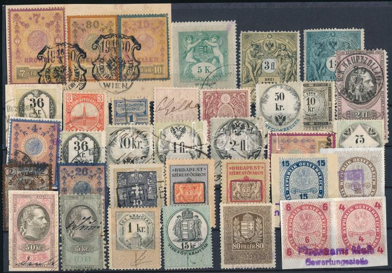 Beschreibung: 35 db régi magyar, osztrák és egyéb külföldi okmánybélyeg