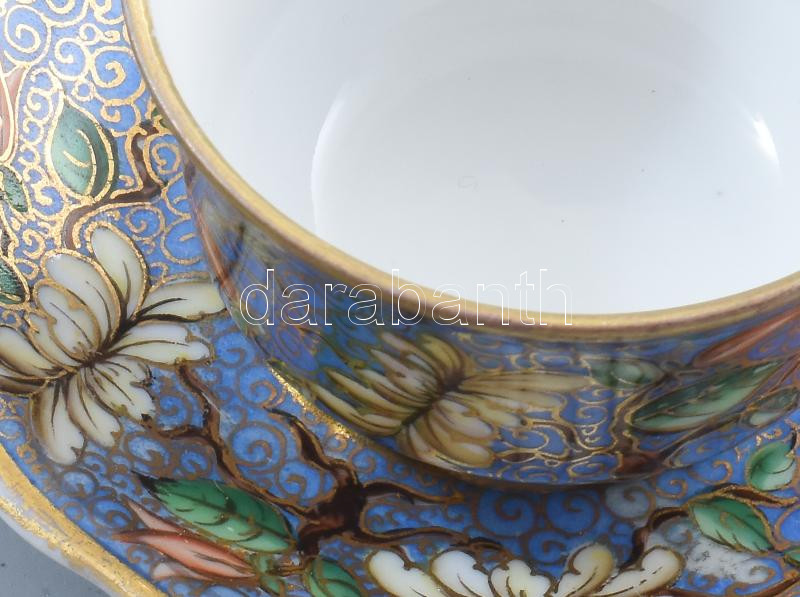 Beschreibung: Zsolnay mokkás csésze alátéttel. cca 1925, ritka mintával, jelzett, kopással, d: 10 cm