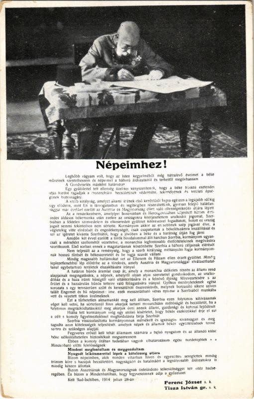 Népeimhez! Ferenc József kiáltványa az Osztrák-Magyar Monarchia népeihez a Szerbia elleni hadba lépésről / Franz Joseph I of Austria, manifesto announcing the Austro-Hungarian the declaration of war on Serbia, starting World War I. B.K.W.I. 1914. (EK)