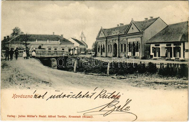 Beschreibung: 1904 Kovászna, Covasna; Fő tér, Gazda-féle ház, Moskovicz Társai üzlete / main square, shops