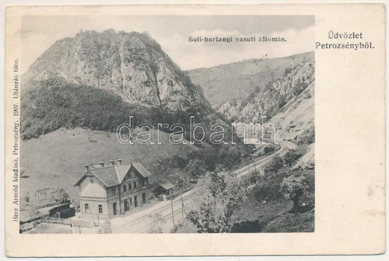 Beschreibung: 1907 Petrozsény, Petrosani; Boli barlang vasútállomás. Herz Arnold kiadása / railway station near Pestera Bolii (gyűrődés / crease)