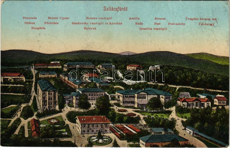 1914 Szliács, Sliac; Pannonia, Otthon, Hungaria, Fürdőház, Buda, Belevue, Bristol, Újpest, Huszka vendéglő, Amália, Strauss, Dankovsky kávéház és étterem, Pest és Pestszárny szálloda, Izraelita zsidó vendéglő, Üdvözlégy, Üvegház kertész lak. Molnár M. kiadása / hotels, Jewish restaurant, greenhouse, café, villa (EK)