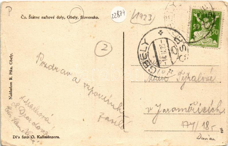 Beschreibung: 1923 Egbell, Gbely; Cs. státne naftové doly / olaj bánya, iparvasút / oil mine, industrial railway (EB)