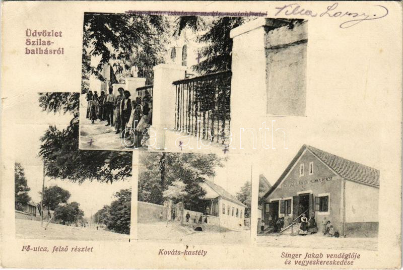 1918 Szilasbalhás (Mezőszilas), Fő utca felső részlet, Kováts kastély, Singer Jakab vendéglője és vegyeskereskedése, Római katolikus iskola és m. kir. postahivatal. Kiadja Szilágyi (Rb)