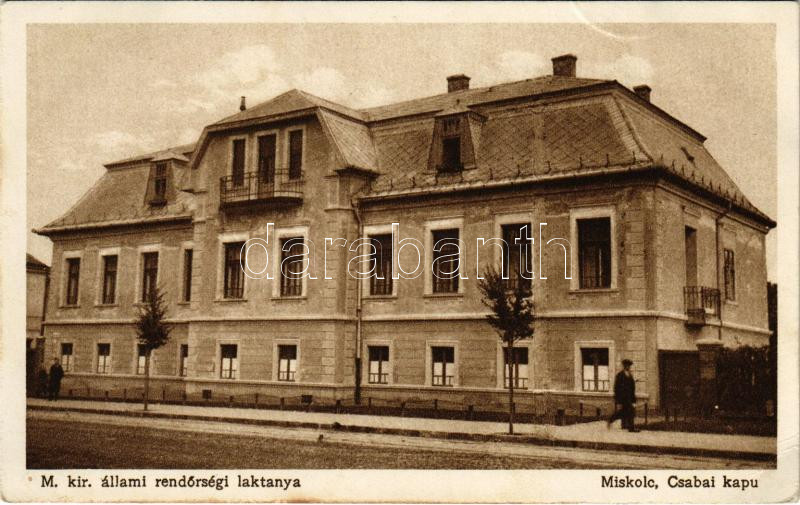 1929 Miskolc, M. kir. állami rendőrségi laktanya, Csabai kapu. Grünwal... https://www.darabanth.com/de/464-Fernauktion/464.0/Ansichtskarten/Ungarn~2000005/1929-Miskolc-M-kir-allami-rendorsegi-laktanya-Csabai-kapu-Grunwald-Ignac-kiadasa-Foto~II3126831