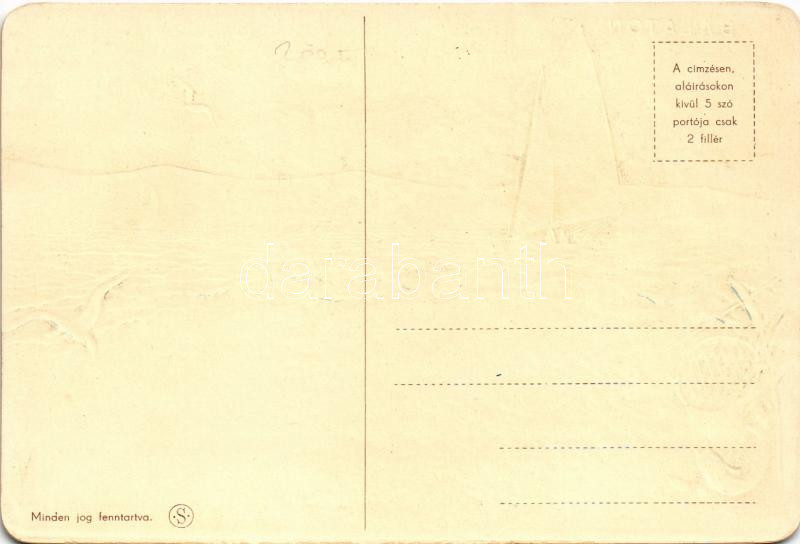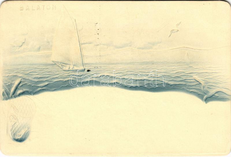 Beschreibung: Balaton. Dombornyomott szecessziós művészlap halászhálóval és vitorlással