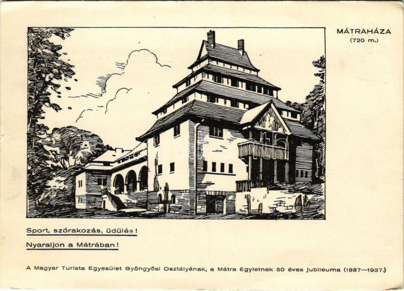 Beschreibung: Mátraháza (Gyöngyös), reklámlap. A Magyar Turista Egyesület Gyöngyösi Osztályának, a Mátra Egyletnek 50 éves jubileuma 1887 - 1937. (EK)