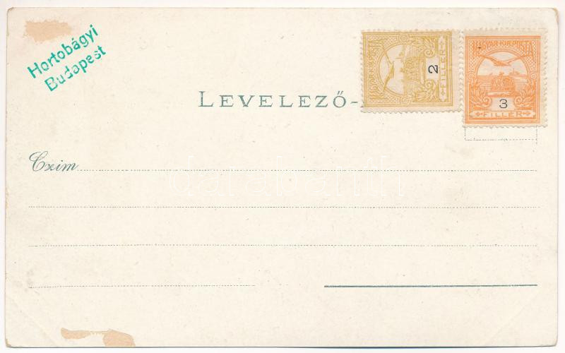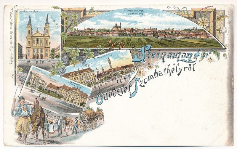 Beschreibung: Szombathely, Steinamanger; Székesegyház, Fő tér, Vármegyeház, színház, városháza. Özv. Fekete Istvánné No. 736. szőlő, Art Nouveau, floral, litho (Rb)