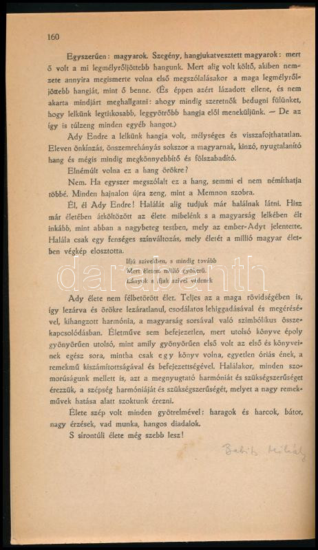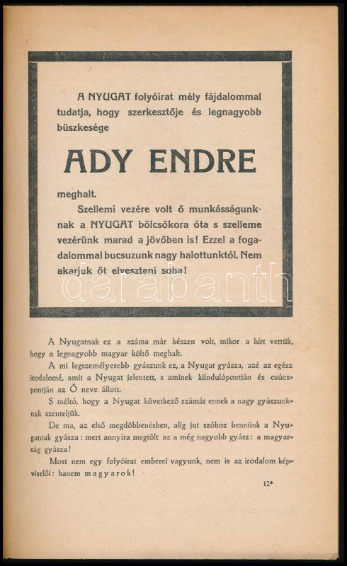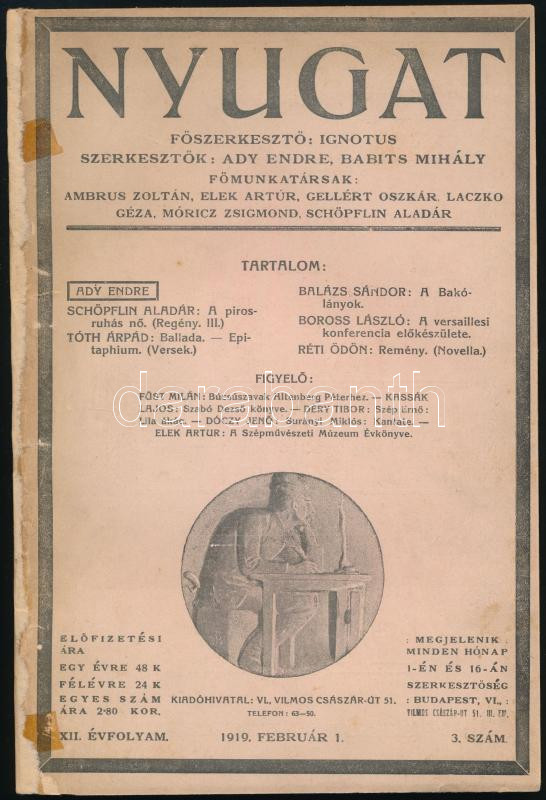 1919 Nyugat. 1919. feb. 1. száma. XII. évf. 3. sz. Főszerkesztő: Ignotus. Szerk.: Ady Endre, Babits Mihály. Bp., 1919, Pallas, 3+160-220 p. Benne Ady Endre halálhírével, mintegy kétoldalas megemlékezéssel Babits Mihály tollából. Restaurált kiadói papírkötés.