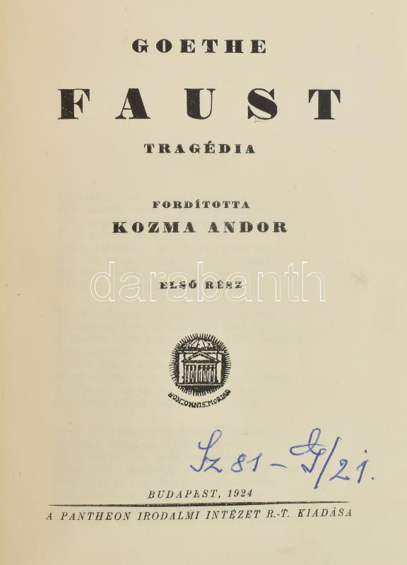 Goethe: Faust. Ford.: Kozma Andor. Bp., 1924. Pantheon. Újrakötött fél... https://www.darabanth.com/de/464-Fernauktion/464.0/Bucher/Bucher-Andere-kuriositaten~1500033/Goethe-Faust-Ford-Kozma-Andor-Bp-1924-Pantheon-Ujrakotott-felborkotesben-nehany-serult~II3105709