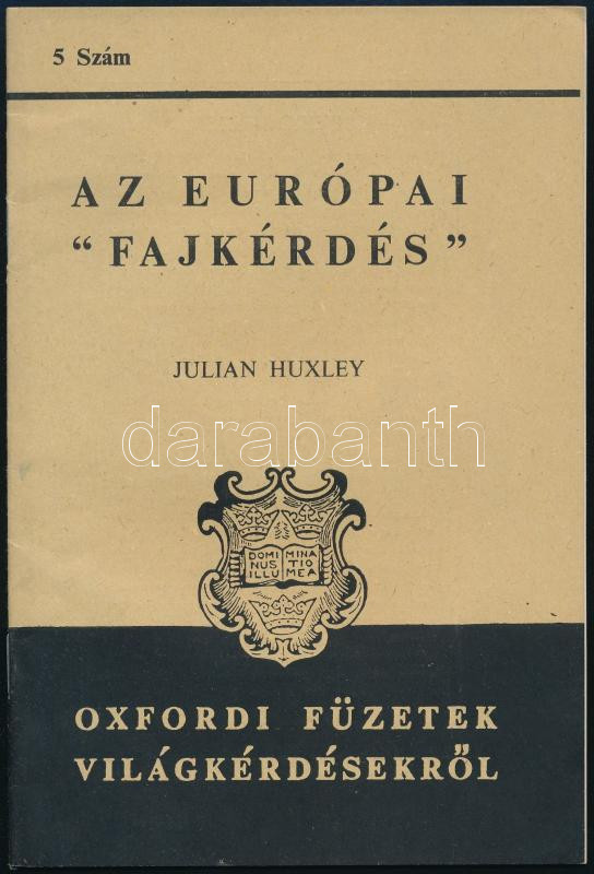 Huxley, Julian: Az európai "fajkérdés". Oxfordi füzetek világkérdésekről 5. sz. [Oxford], 1939, [Univ. Press], 35+(1) p. Első magyar nyelvű kiadás. Kiadói tűzött papírkötés