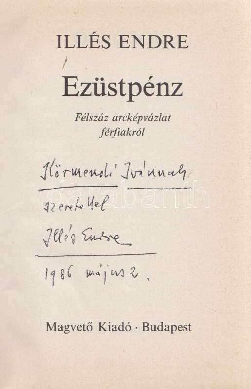 ... https://www.darabanth.com/de/464-Fernauktion/464.0/Bucher/Bucher-Andere-kuriositaten~1500033/Illes-Endre-Ezustpenz-Felszaz-arckepvazlat-ferfiakrol-DedikaltBudapest-1986-Magveto-Kiado~II3128017