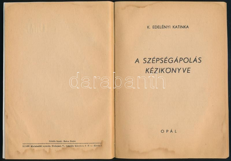 K. Edelényi Katinka: A szépségápolás kézikönyve. Bp., é.n. Opál. Az eredeti papírborító felhasználásával újrakötött papírkötés, foltos lapokkal, kopott borítóval.