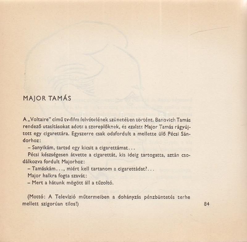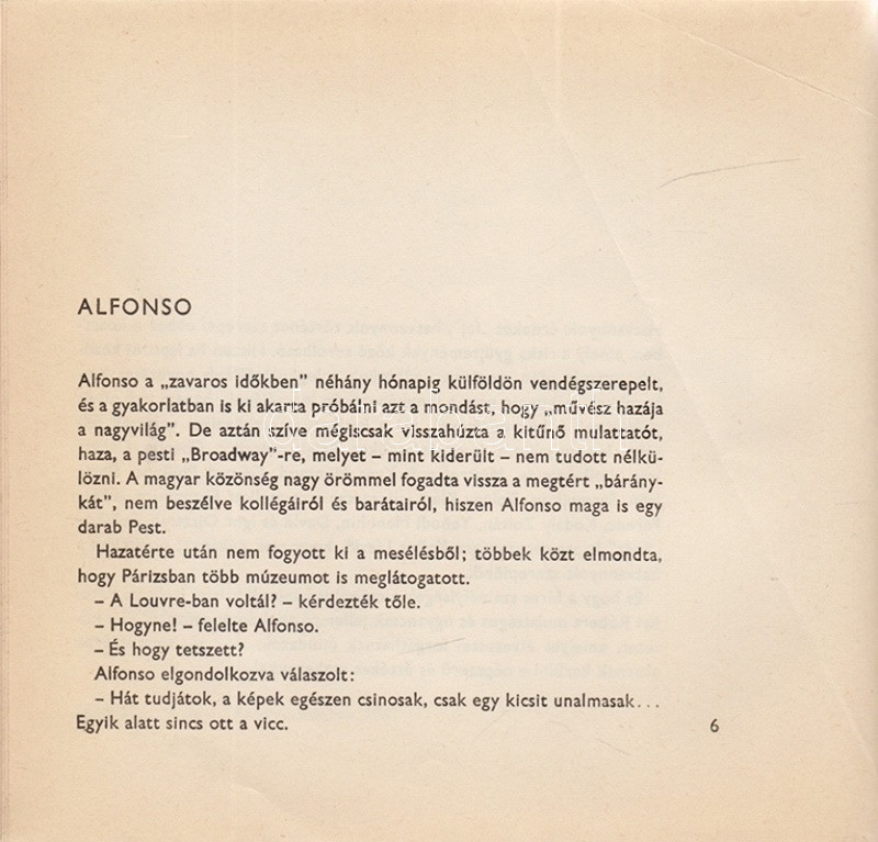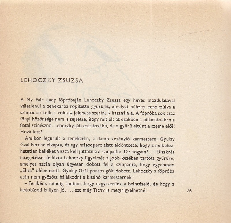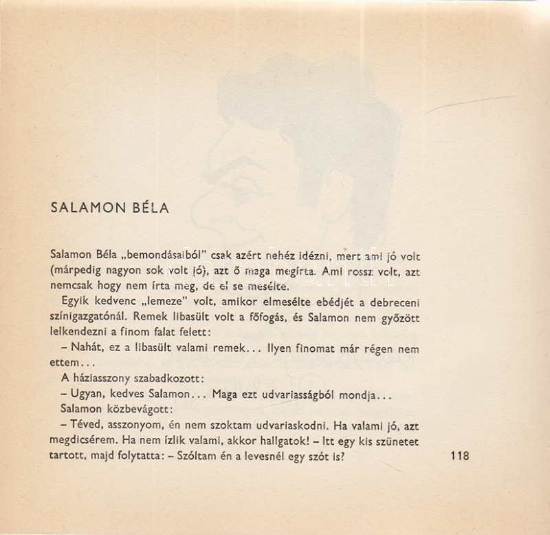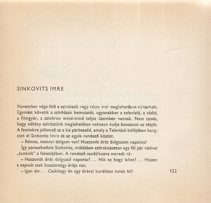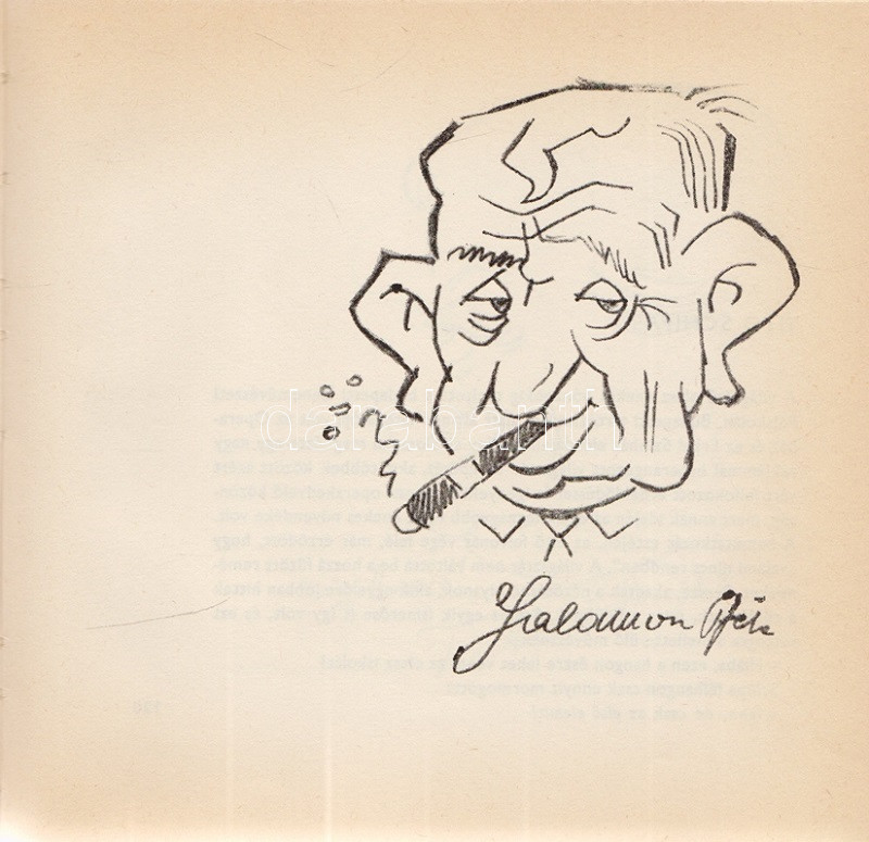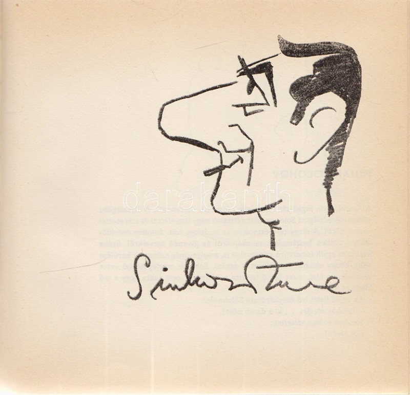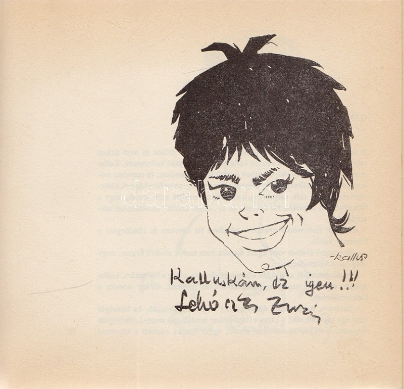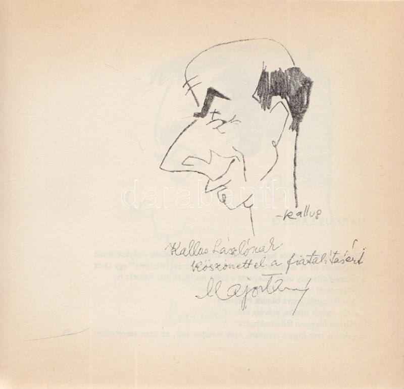 Dedikált: ,,Bellának, a leghűségesebb nézőmnek... abban a reményben: hogy hűséges olvasóm is lesz! Kézcsókkal: Rátonyi Róbert. 1969. X. 20". A rövid anekdotákat oldalszámozáson belül Kallus László egész oldalas művész-karikatúrái kísérik.